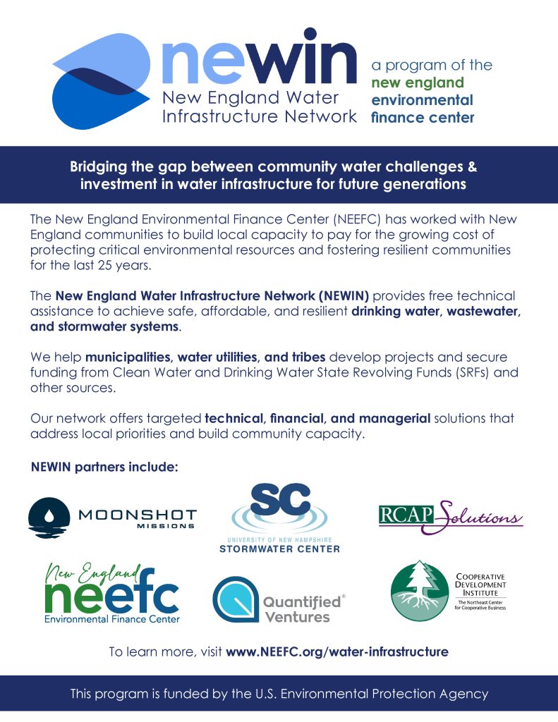 The New England Water Infrastructure Network (NEWIN) provides free technical, financial, and managerial assistance to the region’s municipalities, water utilities, and tribes. Our network offers targeted solutions that address local priorities, build community capacity, and advance projects closer to securing funding from Clean Water and Drinking Water State Revolving Funds (SRFs) and other sources.